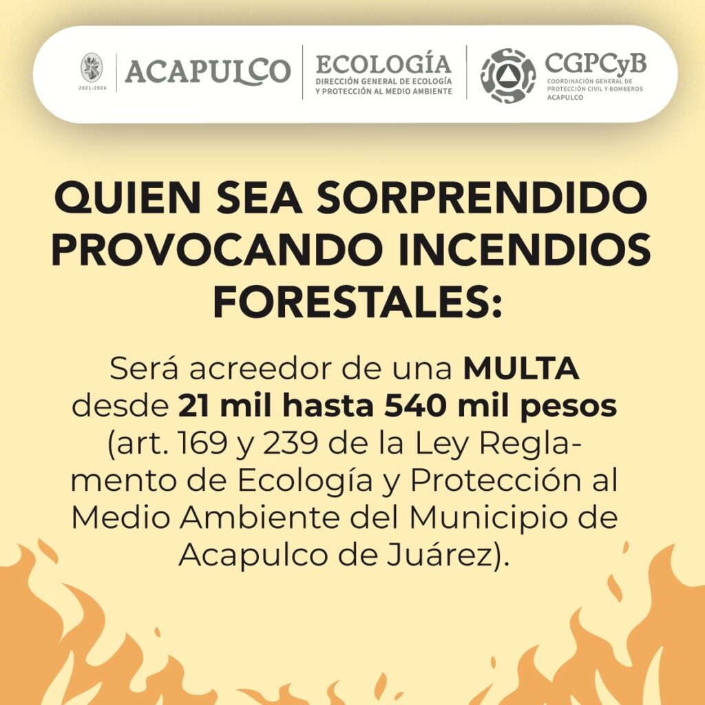Es importante mencionar, que aquellas personas que sean sorprendidas quemando desechos; serán sancionadas con multas que van de los 21 mil hasta los 541 mil pesos, e incluso podrían ser detenidos por daños al medio ambiente, esto de acuerdo al Decreto modificado del Parque Nacional El Veladero, en la Ley General de Desarrollo Forestal Sustentable y en la Ley Número 488 de Desarrollo Forestal Sustentable, así como en el Reglamento de Ecólogia y Protección al Medio Ambiente del municipio de Acapulco.