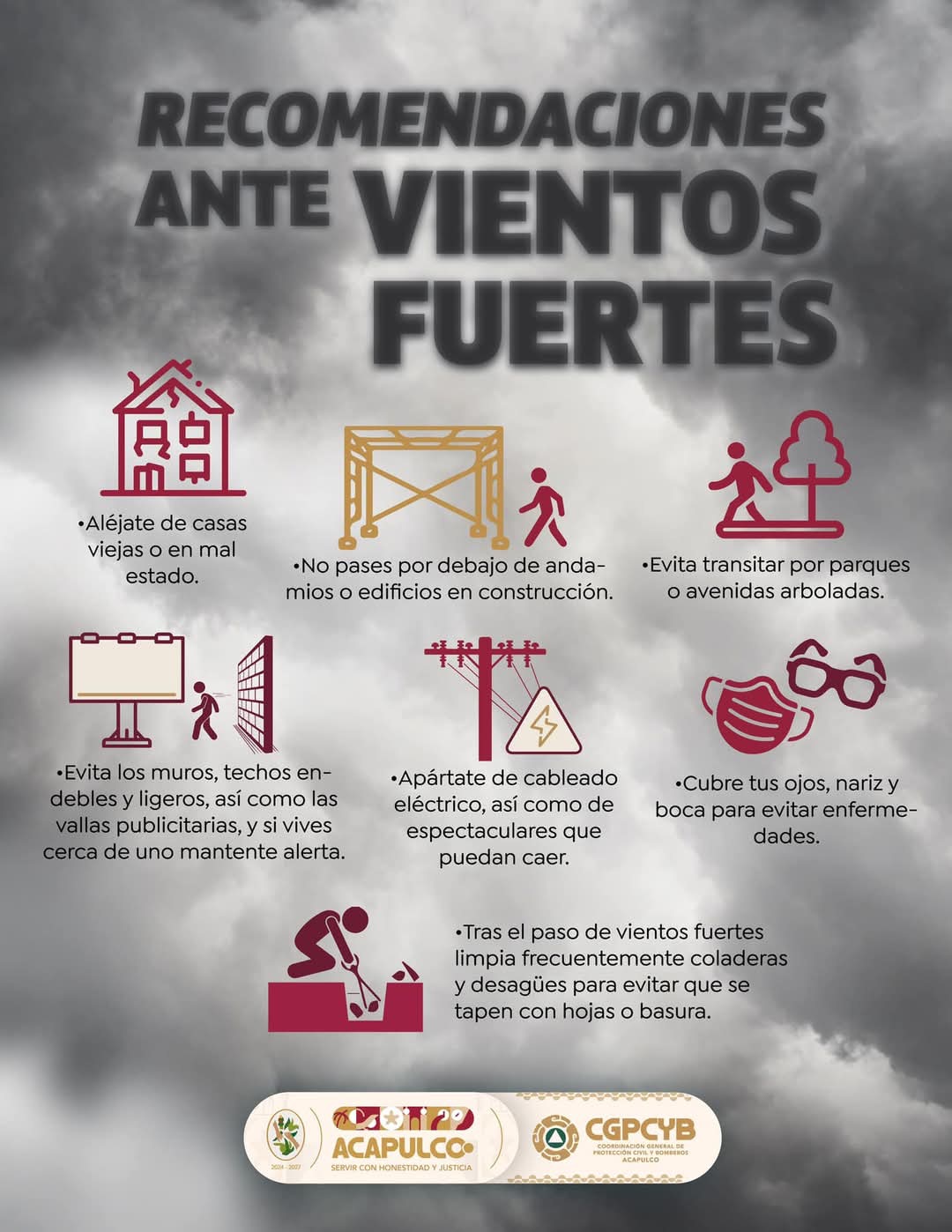 Acapulco, Gro., 12 de enero de 2025.- El Gobierno Municipal de Acapulco que preside Abelina López Rodríguez a través de la Coordinación General de Protección Civil y Bomberos emite recomendaciones a la población ante los vientos que se han registrado en las últimas horas.