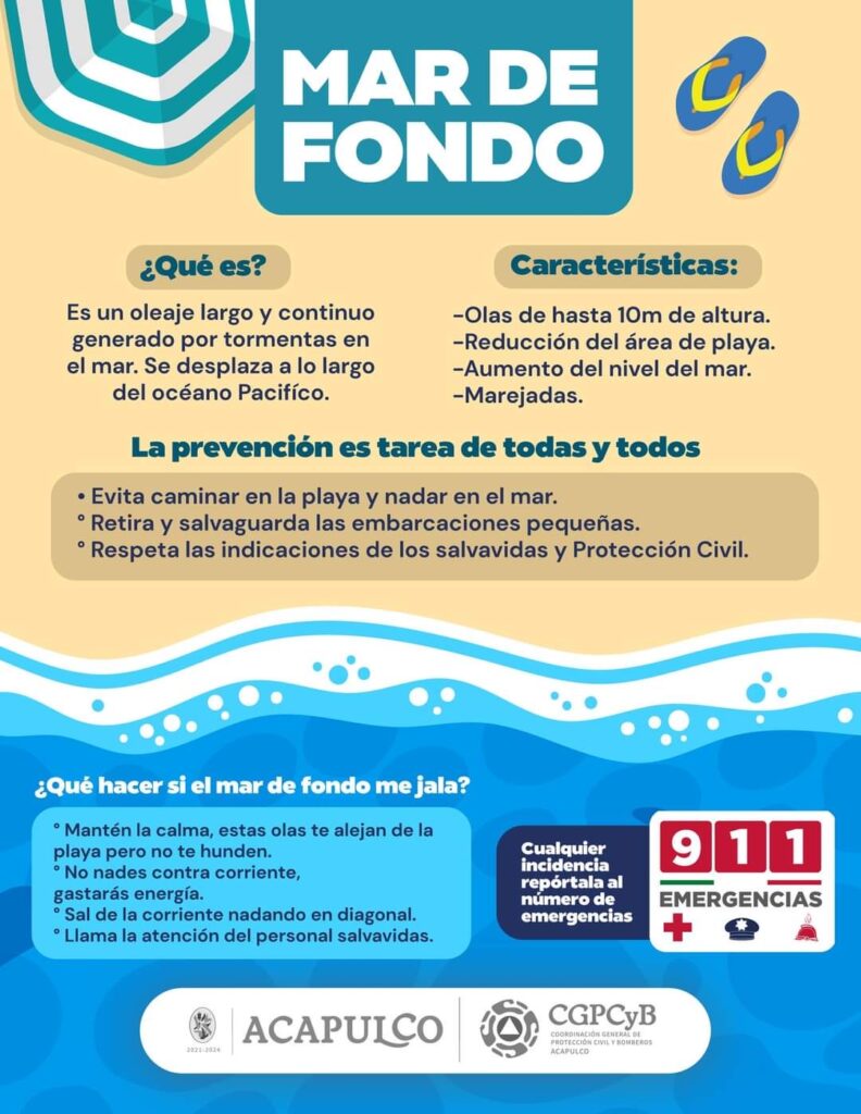 Ante este aviso, se exhorta a la población a tener precaución al visitar las playas, principalmente en zonas de mar abierto como Barra Vieja, Bonfil y Pie de la Cuesta, por los cambios repentinos en el oleaje.