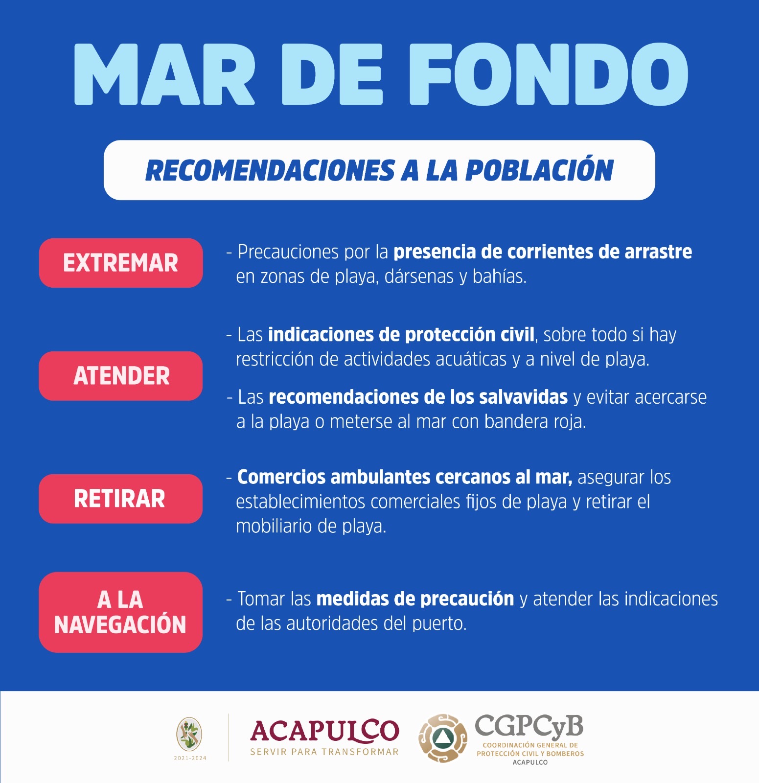 El Gobierno Municipal de Acapulco a través de la Coordinación General de Protección Civil y Bomberos, hace el llamado a tomar precauciones ante el evento de mar de fondo en el Océano Pacífico, que se espera, prevalezca en las próximas horas.