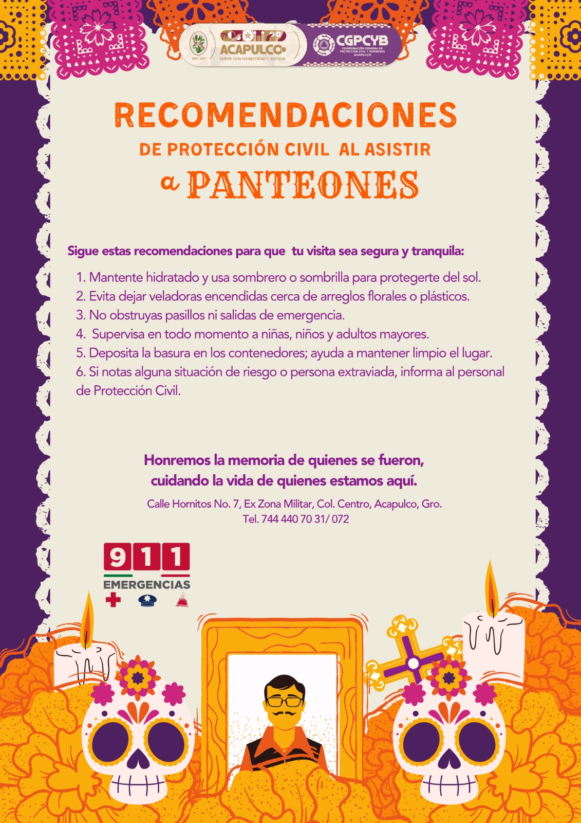 Acapulco, Gro., 29 de octubre del 2025.- Con el propósito de garantizar la seguridad de las familias acapulqueñas durante las festividades del Día de Muertos, el Gobierno Municipal que encabeza la presidenta Abelina López Rodríguez, a través de la Coordinación General de Protección Civil y Bomberos, emite una serie de recomendaciones preventivas para disfrutar estas tradiciones con tranquilidad y sin incidentes.