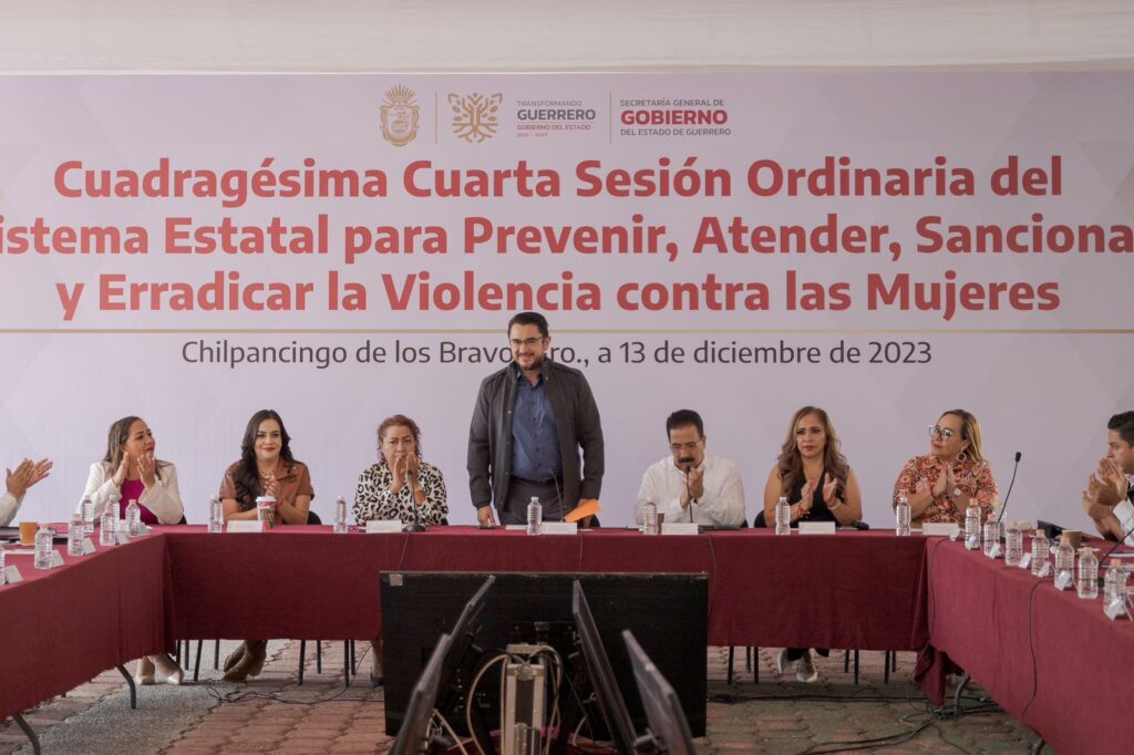 Chilpancingo, Gro., 13 de diciembre de 2023. El secretario general de Gobierno y Presidente del Sistema Estatal para Prevenir, Atender, Sancionar y Erradicar la Violencia contra las Mujeres (SEPASEVM), Ludwig Marcial Reynoso Núñez, encabezó la Cuadragésima Cuarta Sesión del Sistema Estatal para Prevenir, Atender, Sancionar y Erradicar la Violencia contra las Mujeres, donde refrendó el compromiso de combatir la violencia contra las mujeres en el estado.