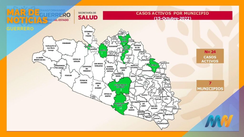 La entidad ocupa el lugar 28 a nivel nacional en casos activos, distribuidos en 7 municipios: Acapulco, 12; Taxco, 4; Iguala, 3; Chilpancingo, 2; Arcelia, 1; Olinalá, 1; y Pungarabato, 1 caso.