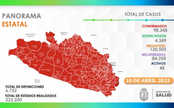Chilpancingo, Gro., 10 de abril 2022.- La Secretaría de Salud informó que hasta el momento, no se ha registrado ninguna defunción por Covid-19 en el mes de abril, y que la entidad se ubica en el lugar 29 a nivel nacional con 48 casos activos, confirmando únicamente 2 nuevos contagios en las últimas 24 horas.