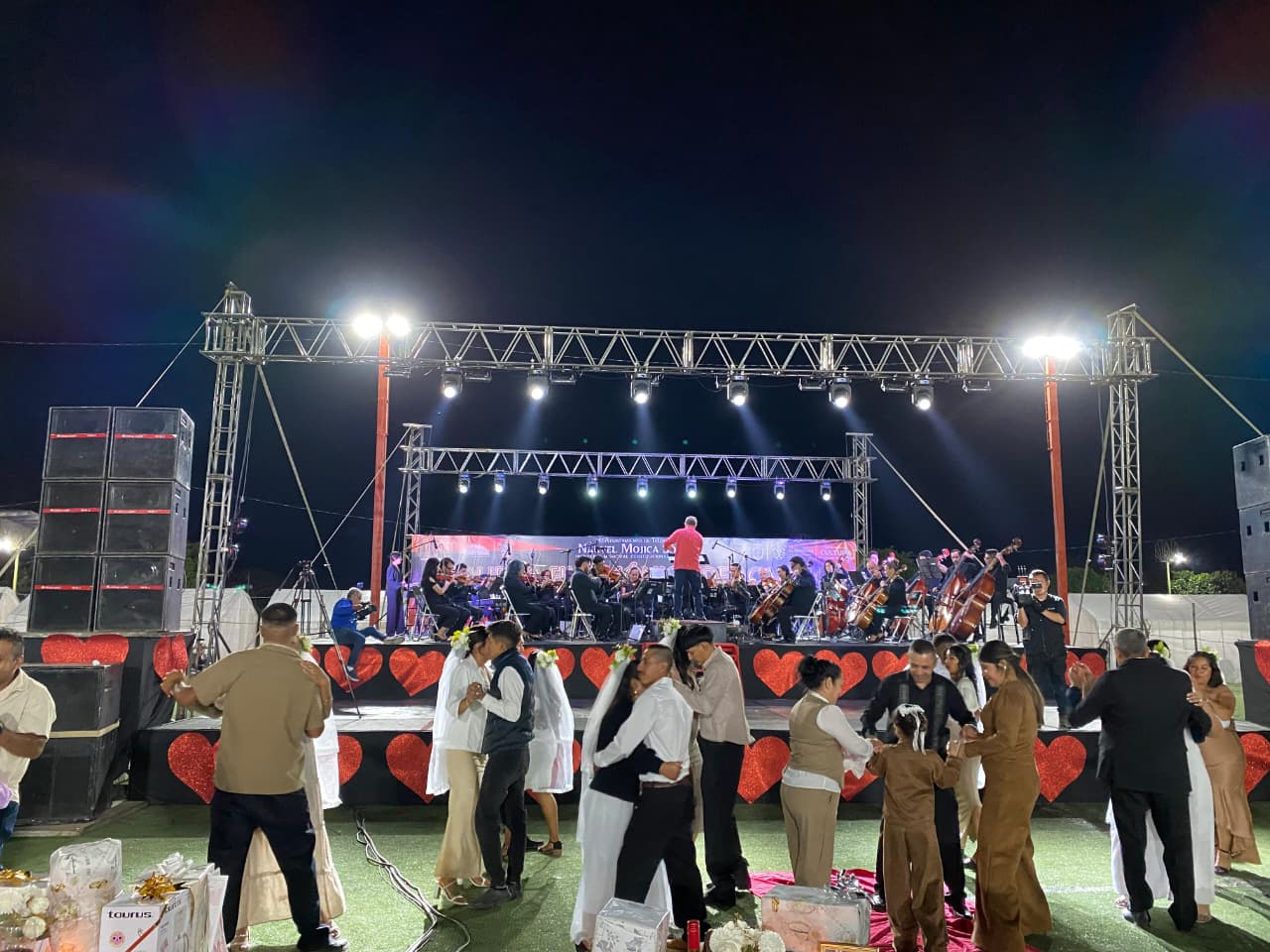 El concierto inició con la emblemática pieza “La Marcha Nupcial” de Félix Mendelssohn y, acompañados por el presidente municipal, Narvel Mojica Sotelo y su esposa, la presidenta del DIF, Araceli Guevara Cervantes, los recién casados bailaron el Vals nº 2 de Dmitri Shostakóvich y el clásico tema romántico “Perfume de Gardenias” interpretado por la Filarmónica y cantado, en una participación especial, por el Maestro Olimpo Pineda, trompetista principal de la OFA.