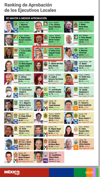 Salgado Pineda se ubica en el lugar número 8 del ranking de aprobación de los ejecutivos locales, registrando un 63.9 por ciento de aprobación, con un incremento de 3.8 por ciento, respecto a la última encuesta realizada.