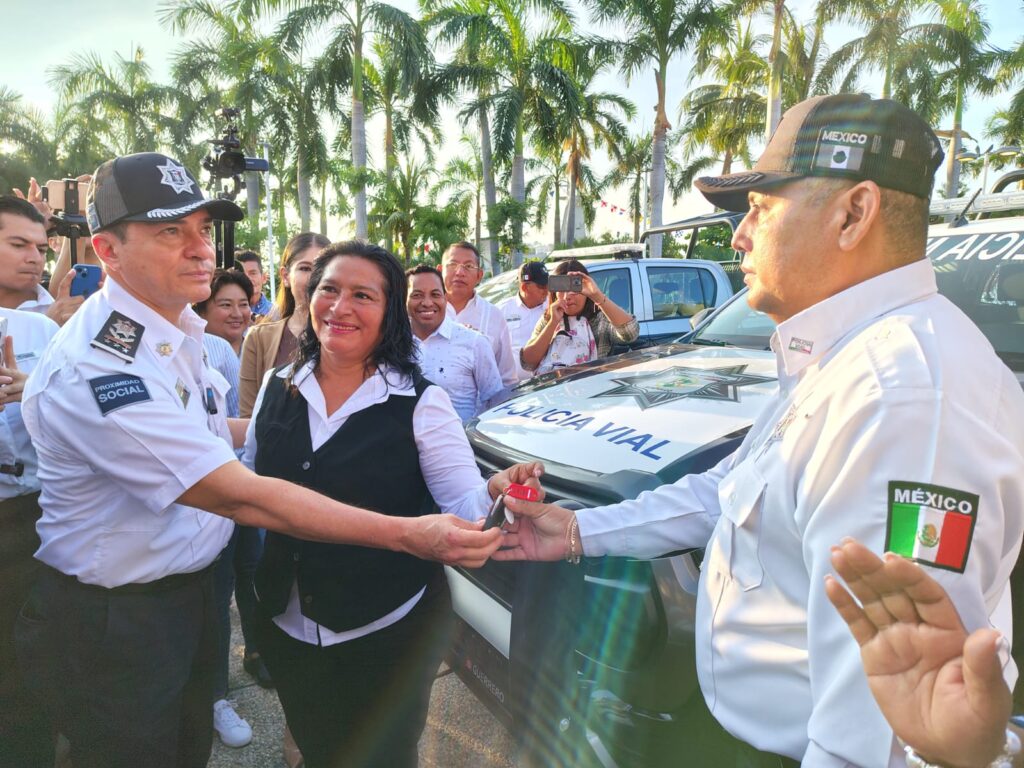 En el parque de La Reina, en compañía de la secretaria General, Leticia Lozano Zavala, funcionarios, ediles y líderes sindicales, la Presidenta Municipal entregó las llaves de estas patrullas al personal de la SSP.