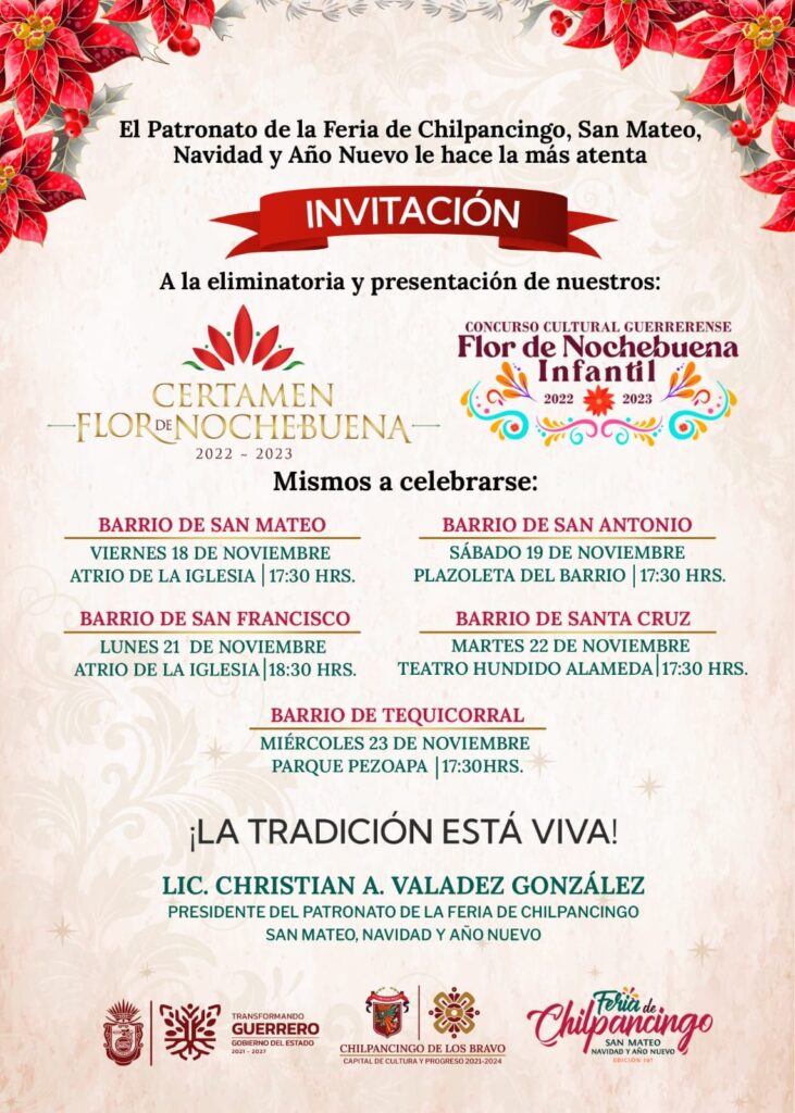 Chilpancingo, gro,. A viernes 18 de noviembre de 2022 – Este viernes 18 de diciembre en el.barrio de San Mateo, dan inicio los certámenes internos Flor de Noche Buena y el concurso cultural guerrerense Flor de Noche Buena infantil 2022-2023, que enmarcan la 197 edición de la feria chilpancingueña.