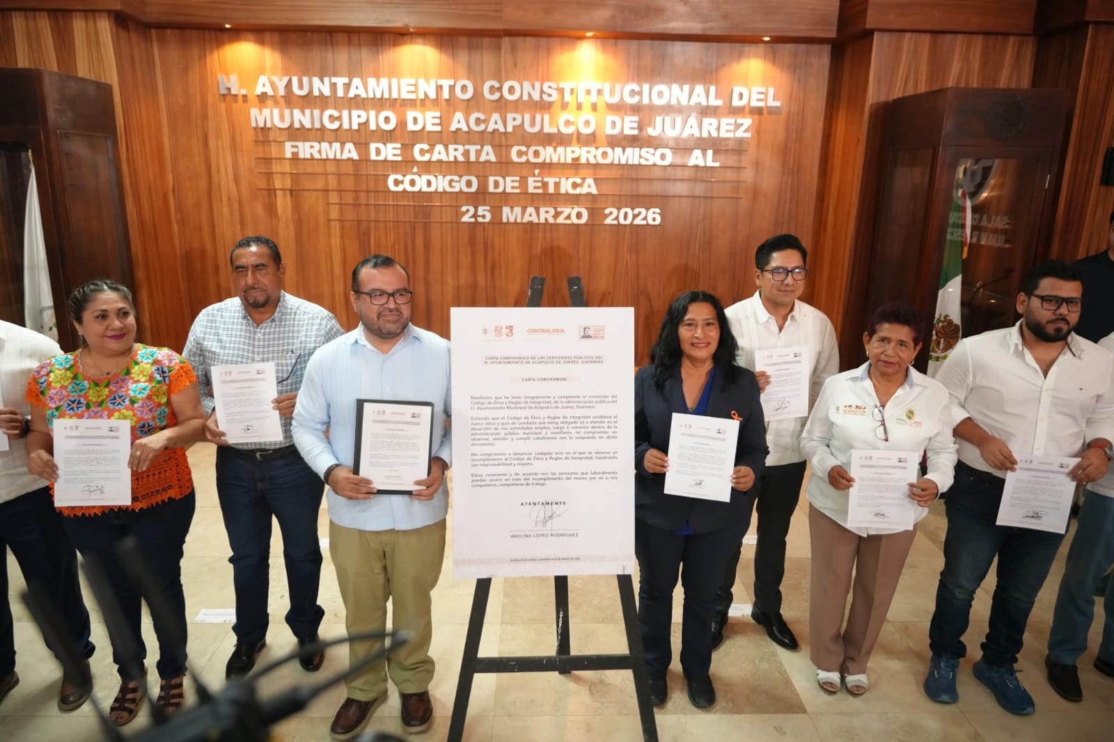 Acapulco, Gro., 25 de marzo de 2026.- Para consolidar un gobierno íntegro, transparente y cercano a la ciudadanía, la alcaldesa Abelina López Rodríguez encabezó la firma de la Carta Compromiso al Código de Ética por parte de servidoras y servidores públicos de diversas dependencias, un acto que resalta la rectitud y la integridad como pilares de la gestión municipal.
