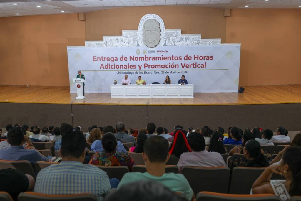 Chilpancingo, Gro., 22 de abril de 2026.-En un acto de justicia laboral para el sector educativo, la gobernadora Evelyn Salgado Pineda realizó la entrega de nombramientos de horas adicionales y promoción vertical a 145 maestras y maestros, reconociendo su esfuerzo, preparación y vocación al servicio de la educación en el estado.
