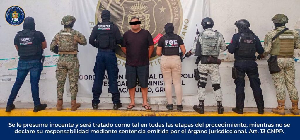 Chilpancingo, Gro., a 27 de julio de 2025.—La Fiscalía General del Estado de Guerrero (FGE Guerrero), en coordinación con la Secretaría de la Defensa Nacional (DEFENSA), Guardia Nacional (GN), Secretaría de Marina (SEMAR), Secretaría de Seguridad y Protección Ciudadana del Gobierno de México (SSPC) y la Secretaría de Seguridad Pública del Estado (SSPGro), cumplimentó una orden de aprehensión en contra de Ricardo “N”, por su probable responsabilidad en el delito de violación, en agravio de una víctima de identidad reservada, en el municipio de Acapulco.