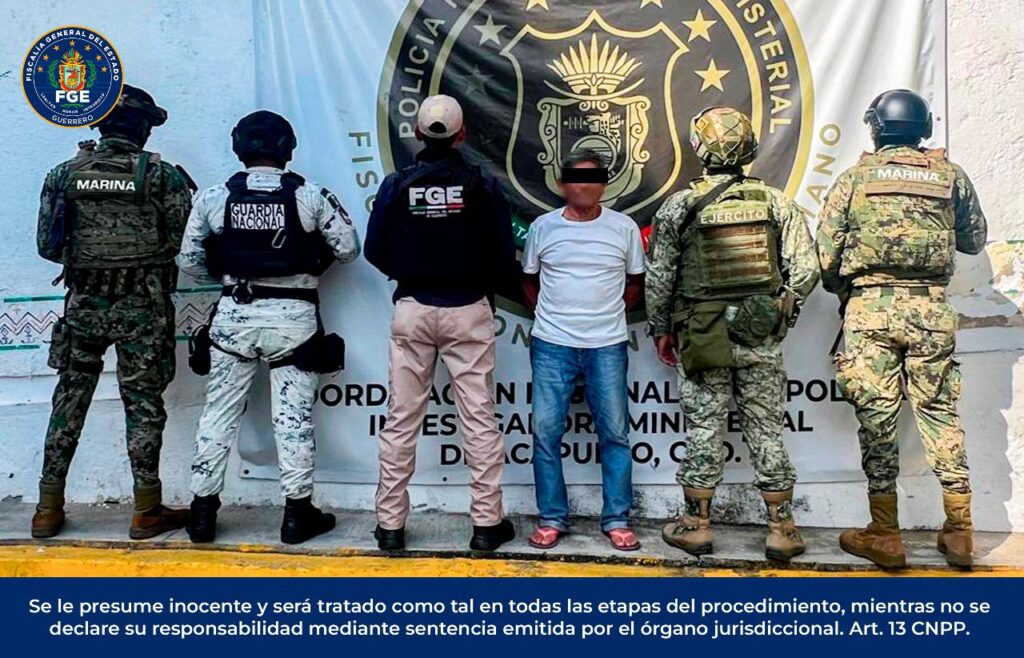 Chilpancingo, Gro., a 27 de julio de 2025.– La Fiscalía General del Estado de Guerrero (FGE Guerrero), en coordinación con la Secretaría de la Defensa Nacional (DEFENSA), Guardia Nacional (GN), Secretaría de Marina (SEMAR), Secretaría de Seguridad y Protección Ciudadana Federal (SSPC) y la Secretaría de Seguridad Pública del Estado (SSPGro), cumplimentó una orden de aprehensión en contra de Alejandro “N”, por su probable responsabilidad en los delitos de homicidio y lesiones, en agravio de Elías “N” y Baltazar “N”, por hechos ocurridos en el municipio de Acapulco de Juárez.