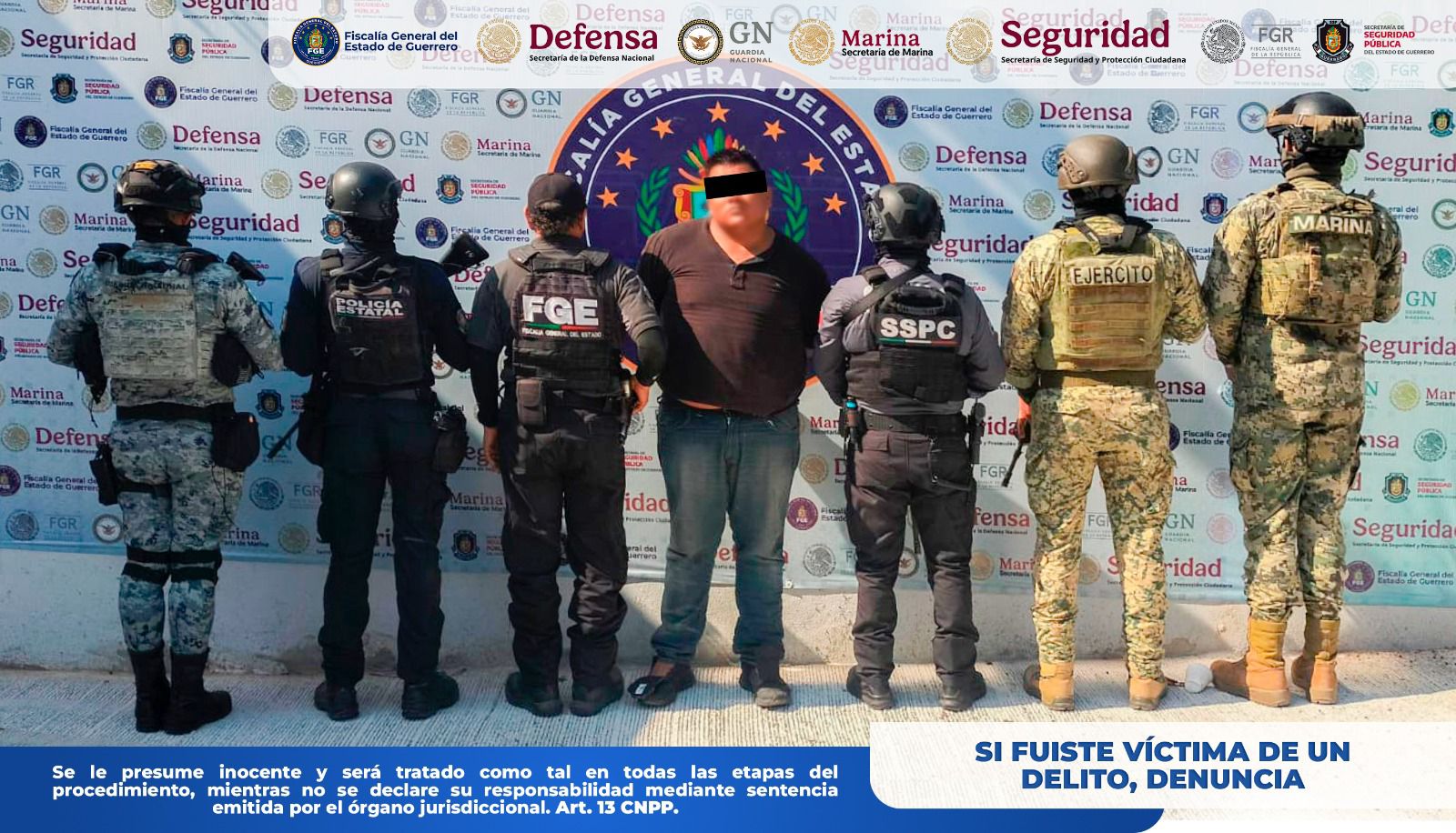 Chilpancingo, Gro., a 12 de febrero de 2026.– La Fiscalía General del Estado de Guerrero informa que, en coordinación con DEFENSA, Guardia Nacional (GN), Secretaría de Marina (SEMAR), Secretaría de Seguridad y Protección Ciudadana (SSPC) y Policía Estatal (SSPGro), cumplimentó una orden de aprehensión en contra de Meynardo “N”, por el delito de desaparición de persona cometida por particulares, en perjuicio de José Antonio “N”, en el municipio de Acapulco de Juárez, Guerrero.