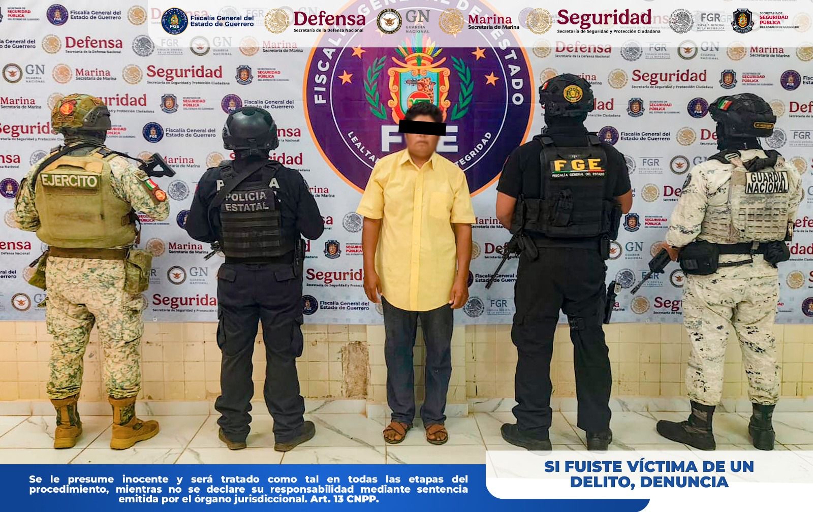 Chilpancingo, Gro., a 28 de febrero de 2026.– La Fiscalía General del Estado de Guerrero informa que, en coordinación con la Secretaría de la Defensa Nacional (DEFENSA), Guardia Nacional (GN), Secretaría de Seguridad y Protección Ciudadana (SSPC) y Policía Estatal (SSPGro), cumplimentó una orden de aprehensión en contra de Andrés “N”, por su probable responsabilidad en el delito de violación agravada, en perjuicio de una víctima de identidad reservada, en el municipio de Tixtla de Guerrero.