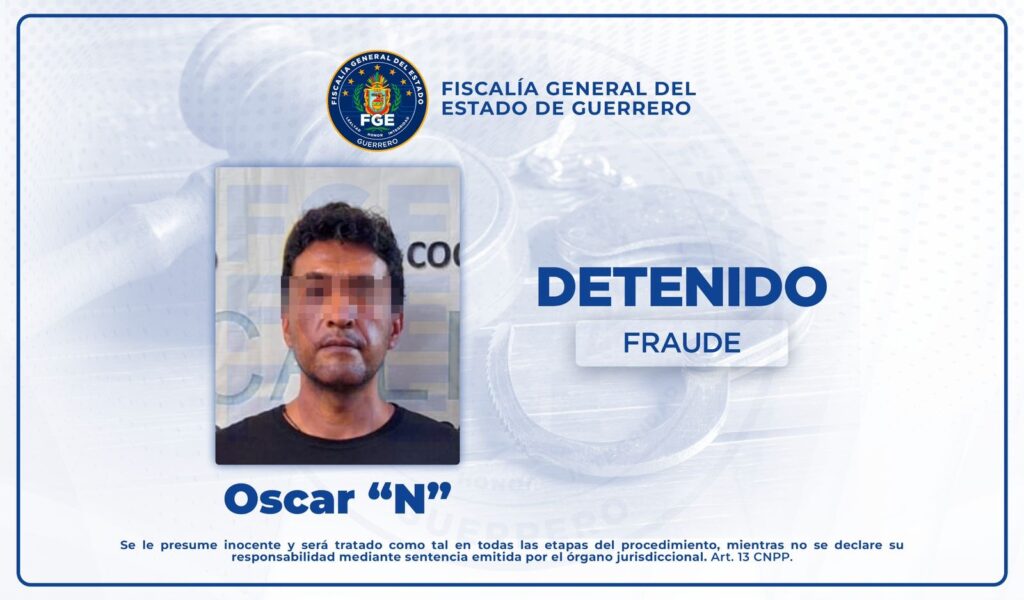 Chilpancingo, Gro. a 23 de julio de 2024.- La Fiscalía General del Estado de Guerrero (FGE), cumplimentó una orden de aprehensión emitida en contra de Oscar “N”, por su probable participación en el delito de fraude, cometido en perjuicio de Emma “N”, por los hechos ocurridos en Taxco de Alarcón.