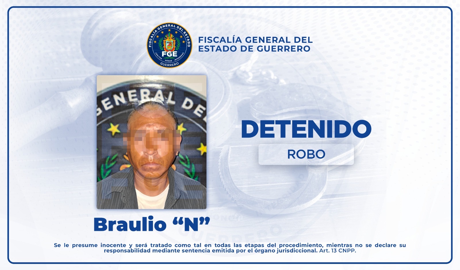 Chilpancingo, Gro. a 23 de julio de 2024.- La Fiscalía General del Estado de Guerrero (FGE), cumplimentó una orden de aprehensión emitida en contra de Braulio “N”, por su probable participación en el delito de robo especifico, cometido en perjuicio de Silverio “N”, por los hechos ocurridos en Tlapa de Comonfort.