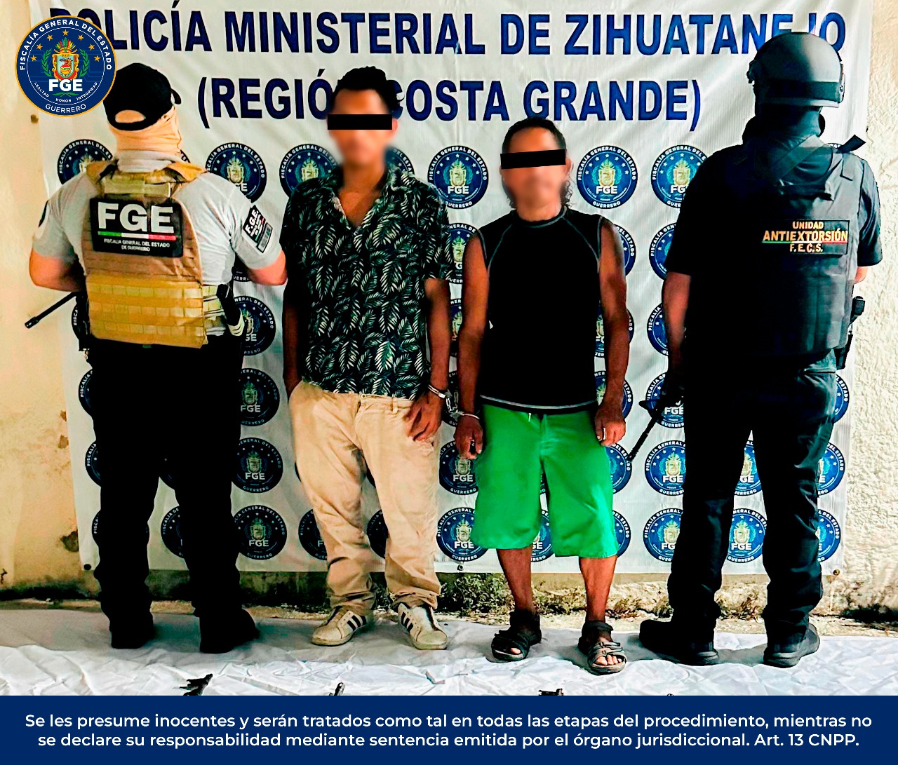 Chilpancingo, Gro., a 4 de junio de 2025.— La Fiscalía General del Estado de Guerrero (FGE Guerrero) informa que, como resultado de una acción conjunta con fuerzas federales y estatales, llevó a cabo la detención en flagrancia de dos personas del sexo masculino, en la colonia La Noria del municipio de Zihuatanejo de Azueta.