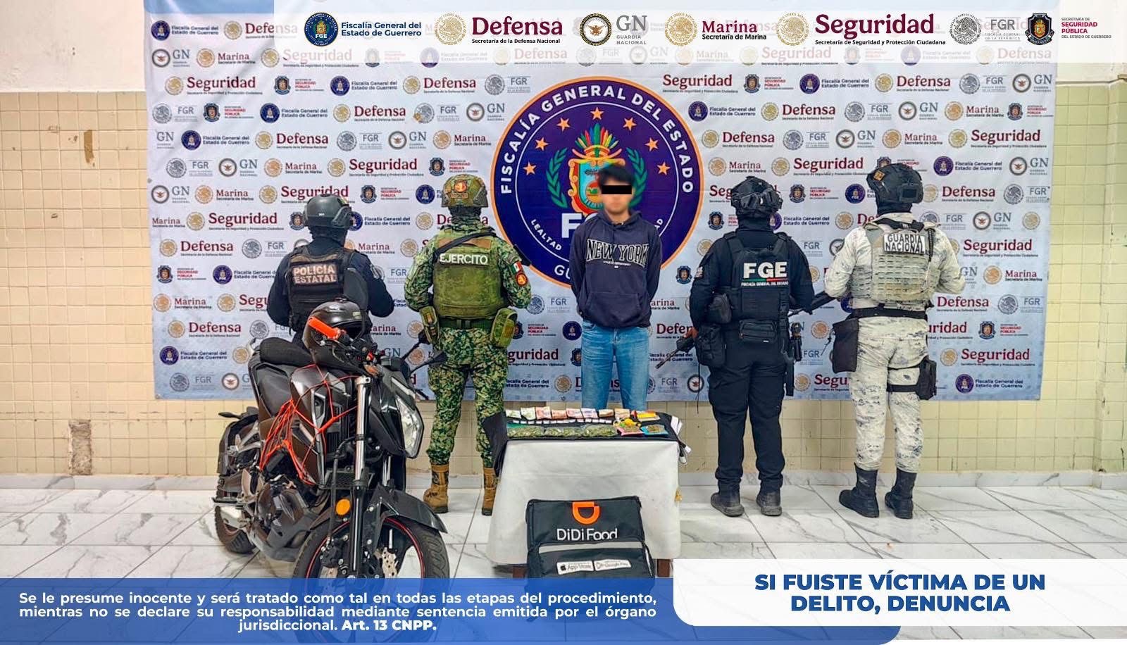 FGE Guerrero detiene en flagrancia a un masculino en Chilpancingo; asegura presunta droga y motocicleta