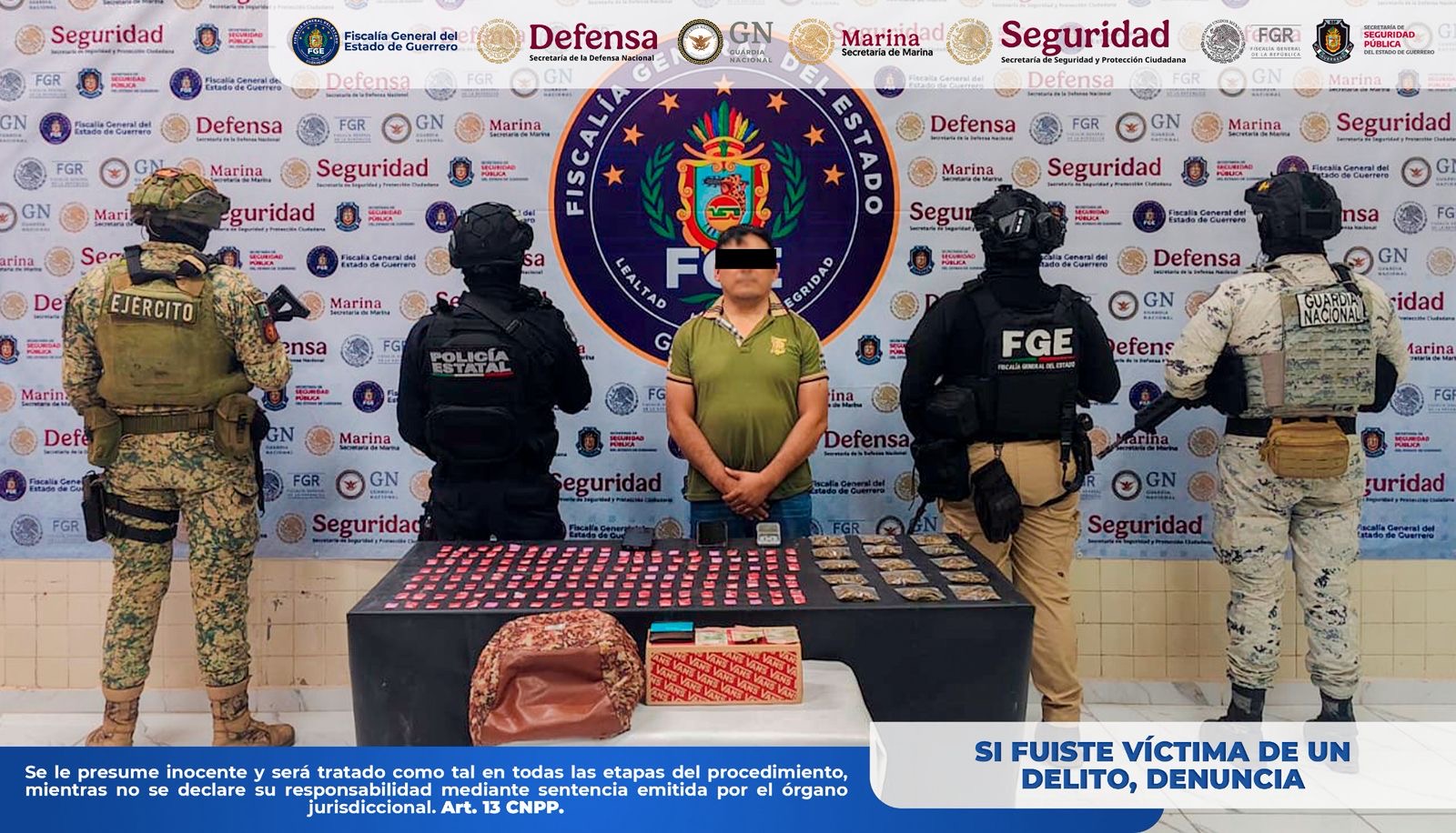 Chilpancingo, Gro., a 12 de febrero de 2026.– La Fiscalía General del Estado de Guerrero informa que personal de esta institución, en coordinación con la Secretaría de la Defensa Nacional (DEFENSA), Guardia Nacional (GN), Secretaría de Seguridad y Protección Ciudadana (SSPC) y Policía Estatal (SSPGro), realizó la detención en flagrancia de Juevencio “N”, derivado de recorridos de seguridad y vigilancia en el municipio de Chilpancingo de los Bravo, Guerrero.