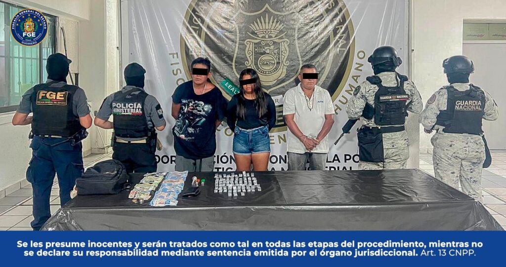 Chilpancingo, Gro., a 24 de enero de 2025. En el marco de las investigaciones, la Fiscalía General del Estado, en coordinación con la Secretaría de la Defensa Nacional, la Guardia Nacional y la Secretaría de Seguridad Pública de Guerrero, detuvo la noche del jueves 23 de enero de 2025, a tres personas presuntamente involucradas en el delito contra la salud en Acapulco.