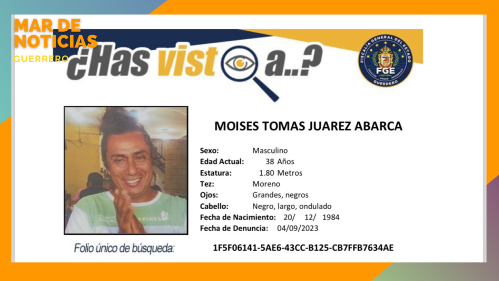 Chilpancingo, Gro. a 5 Septiembre del 2023.- La Fiscalía General del Estado, inició Carpeta de Investigación en contra de quien o quienes resulten responsables, por el delito de Desaparición Cometida por Particulares, en agravio de Moisés Tomás Juárez Abarca, por los hechos ocurridos en Acapulco de Juárez; quien fue visto por última vez el 1 de septiembre del 2023.