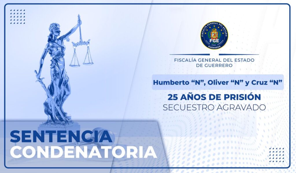 Chilpancingo, Guerrero, a 23 de enero de 2025.- La Fiscalía General del Estado de Guerrero, logró que un juez dictara sentencia condenatoria de 25 años de prisión en contra de Humberto “N”, Oliver “N” y Cruz “N” por el delito de secuestro agravado, cometido en perjuicio de una víctima de identidad reservada.