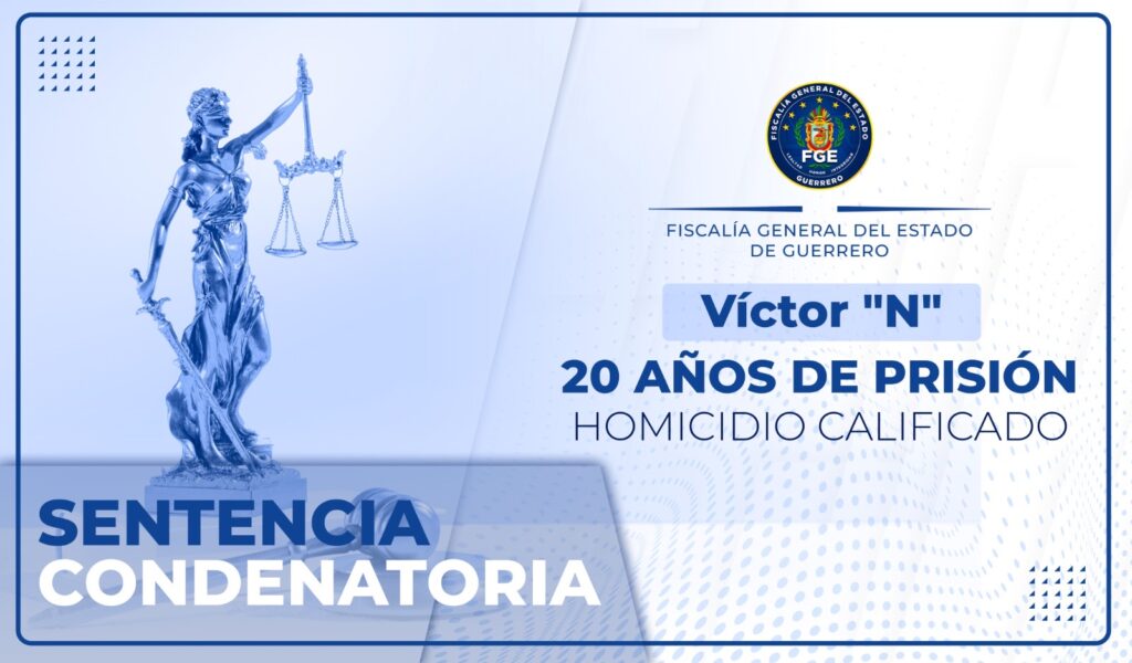 La Fiscalía General del Estado, logró que un juez dictara sentencia condenatoria de 20 años de prisión en contra de Víctor “N” por el delito de homicidio calificado, cometido en perjuicio de Mireya “N”, por los hechos ocurridos el 3 de octubre de 2014, en Acapulco.