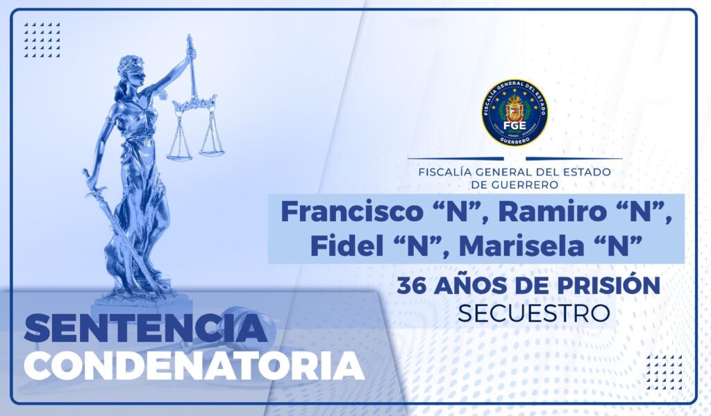 Chilpancingo, Gro. a 11 de mayo de 2024.- La Fiscalía General del Estado, logró que un juez dictara sentencia condenatoria de 36 años de prisión en contra de Francisco “N”, Ramiro “N”, Fidel “N” y Marisela “N”, por el delito de secuestro, cometido en perjuicio de una víctima cuya identidad se reserva, por los hechos ocurridos en Coyuca de Catalán.
