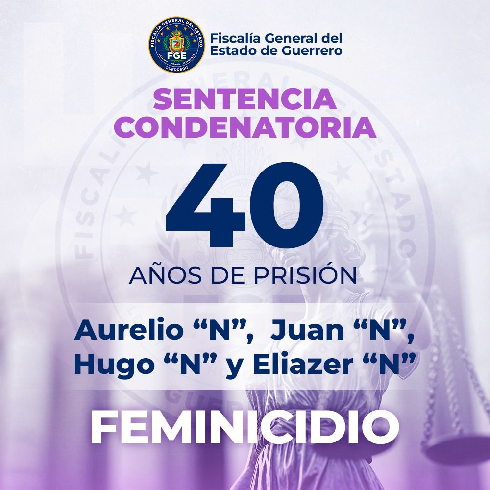 Chilpancingo, Gro., a 08 de octubre de 2025.– La Fiscalía General del Estado de Guerrero obtuvo una sentencia condenatoria de 40 años de prisión en contra de Aurelio “N”, alias “La Curia”; Juan “N”, alias “El Tribilín”; Hugo “N”, alias “La Zoé” y Eliazer “N”, por el delito de feminicidio, en agravio de una víctima menor de edad de identidad reservada en el municipio de Tixtla.
