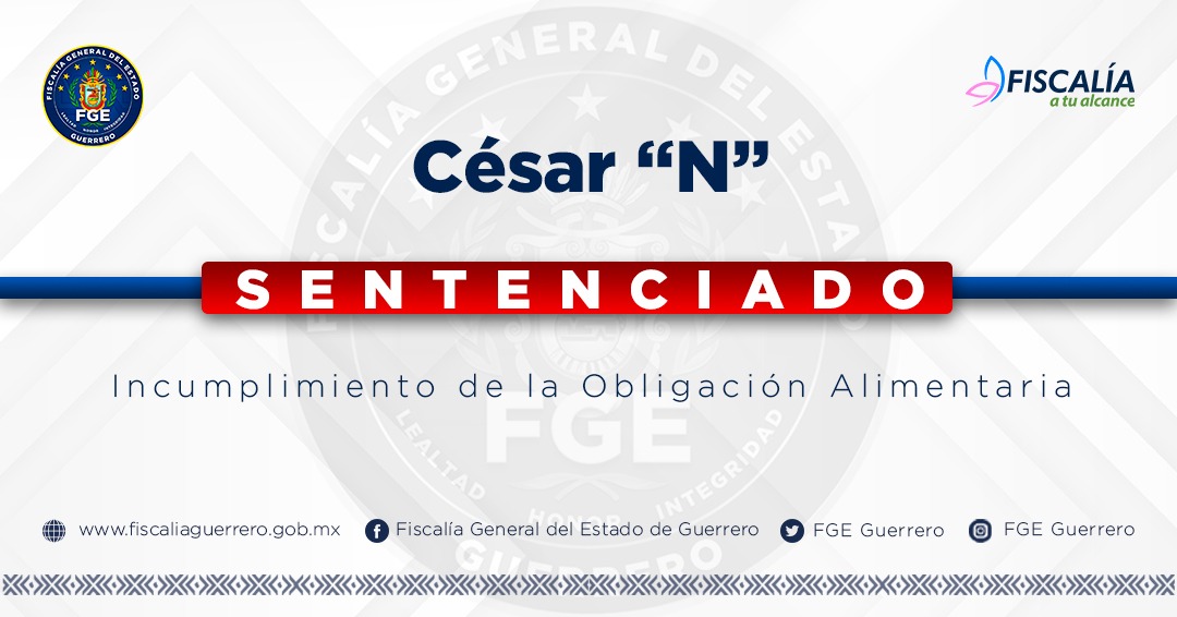 La Fiscalía General del Estado, logró Sentencia Condenatoria en contra de César “N”, por el delito de Incumplimiento de la Obligación Alimentaria, cometido en perjuicio de una víctima menor de edad, cuya identidad se reserva, por los hechos ocurridos en 2016, en Chilpancingo de los Bravo.