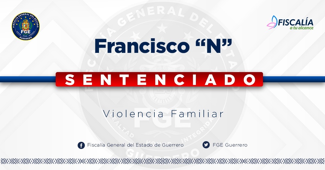 21 de diciembre de 2023. – La Fiscalía General del Estado logró Sentencia Condenatoria en contra de Francisco “N”, por el delito de Violencia Familiar, en perjuicio de una víctima cuya identidad se reserva, por los hechos ocurridos el 7 de abril de 2019, en Chilpancingo de los Bravo.