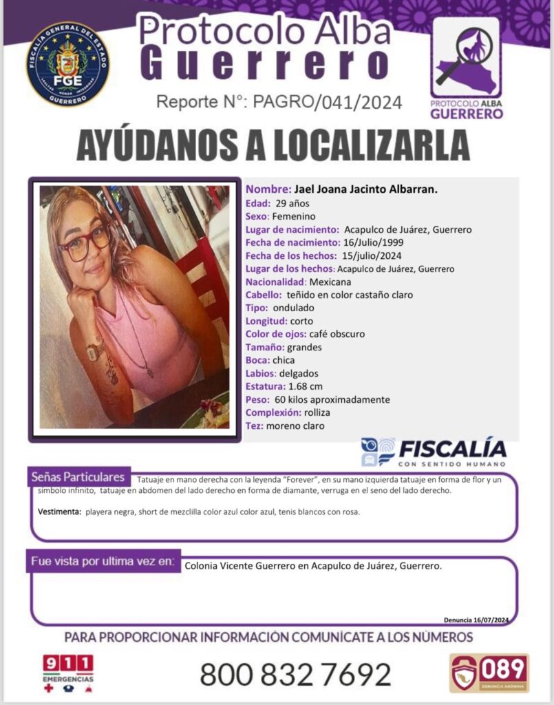 En ese sentido, la FGE Guerrero activó los protocolos correspondientes y emitió la ficha de búsqueda del Protocolo Alba; asimismo, personal de la PIM realiza recorridos en distintas áreas del puerto, para la pronta localización de la mujer, además de mantener la atención directa con los familiares de Jael “N”.