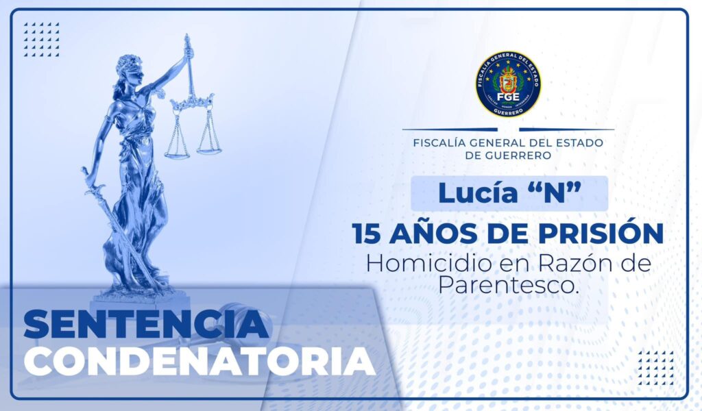 Chilpancingo, Gro. a 21 de agosto de 2024.- La Fiscalía General del Estado de Guerrero, logró que un juez dictara sentencia condenatoria de 15 años de prisión en contra de Lucía “N”, por el delito de homicidio en razón de parentesco en perjuicio de una víctima menor cuya identidad se reserva, por los hechos ocurridos en la colonia Francisco Vila, del municipio de Atoyac de Álvarez.
