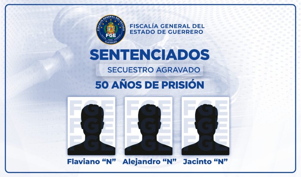FGE Guerrero sentencia a 50 años de prisión a 3 imputados por secuestro agravado en Acapulco.