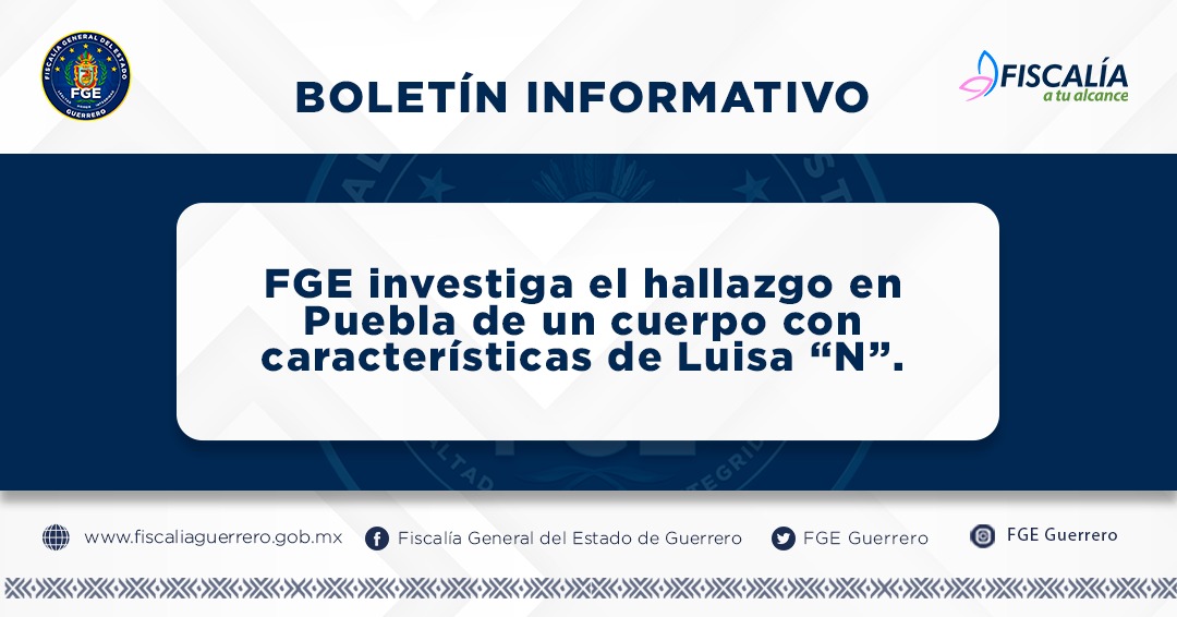 Chilpancingo, Gro. a 22 de Diciembre del 2023.- La Fiscalía General del Estado informa que, en respuesta a los alertamientos girados del “Protocolo Alba” por la Fiscalía Especializada en Desaparición Forzada y Búsqueda de Personas Desaparecidas de esta institución, el día de ayer se recibió respuesta de la Fiscalía General de Puebla, sobre la localización en el Municipio de Izúcar de Matamoros de un cuerpo que pudiera responder a las características físicas de Luisa “N”, persona que cuenta con reporte de desaparición desde el 12 de Diciembre del 2023; sin embargo, serán los estudios genéticos los cuales determinen la identidad de dicha persona.