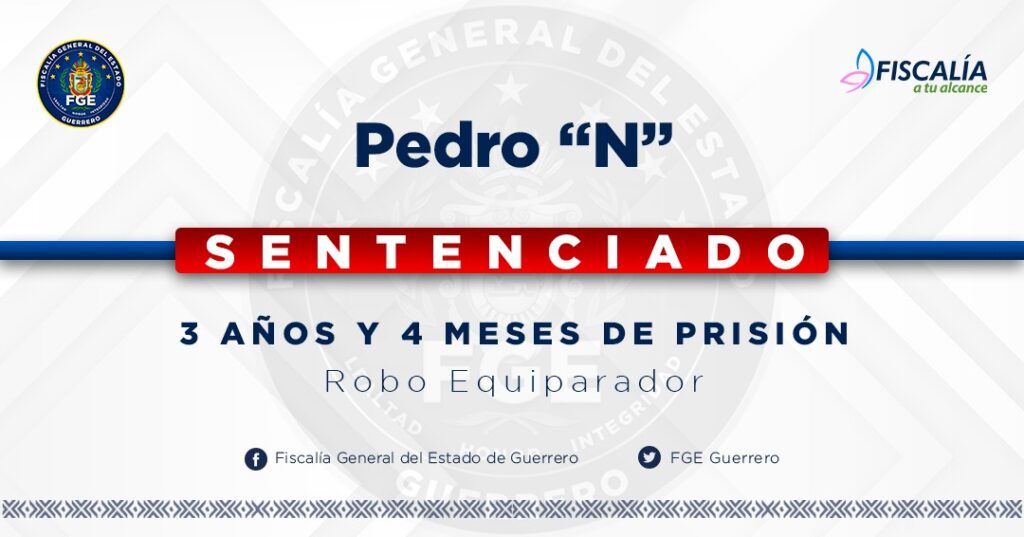 3 De deptiembre de 2023. -La Fiscalía General del Estado, logró Sentencia Condenatoria en contra de Pedro “N”, por el delito de Robo Equiparado, cometido en perjuicio Anette “N” y Froilán “N”, por los hechos ocurridos en Cutzamala de Pinzón.