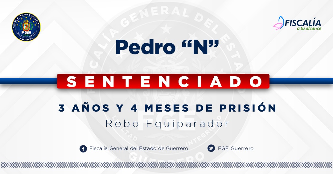 3 De deptiembre de 2023. -La Fiscalía General del Estado, logró Sentencia Condenatoria en contra de Pedro “N”, por el delito de Robo Equiparado, cometido en perjuicio Anette “N” y Froilán “N”, por los hechos ocurridos en Cutzamala de Pinzón.