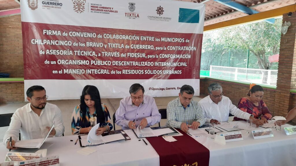 Chilpancingo, Gro., 19 de enero de 2023.- Con la finalidad de fortalecer las acciones para la adecuada gestión integral de los residuos sólidos urbanos, la Secretaría del Medio Ambiente y Recursos Naturales (SEMAREN), firmó el convenio de colaboración entre los municipios de Chilpancingo y Tixtla, para la contratación de asesoría técnica, a través del FIDESUR para la conformación de un organismo público descentralizado intermunicipal en el manejo integral de los residuos sólidos urbanos.