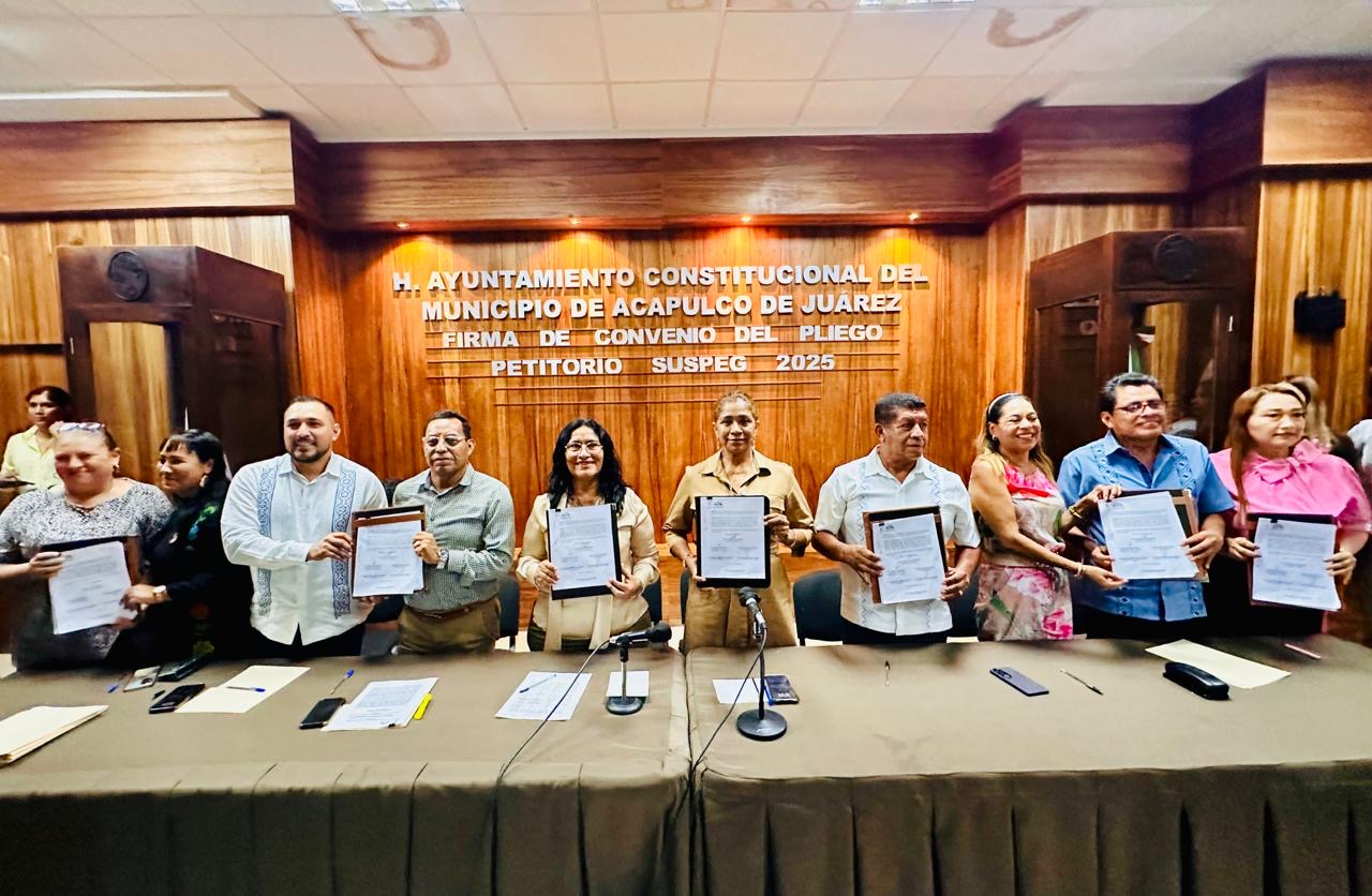 Acapulco, Gro., 29 de mayo de 2025.- Con el compromiso de velar por los derechos y conquistas de las y los trabajadores, la Presidenta Municipal, Abelina López Rodríguez firmó junto a líderes sindicales el Convenio del Pliego Petitorio del Sindicato Único de Servidores Públicos del Estado de Guerrero (SUSPEG) 2025.