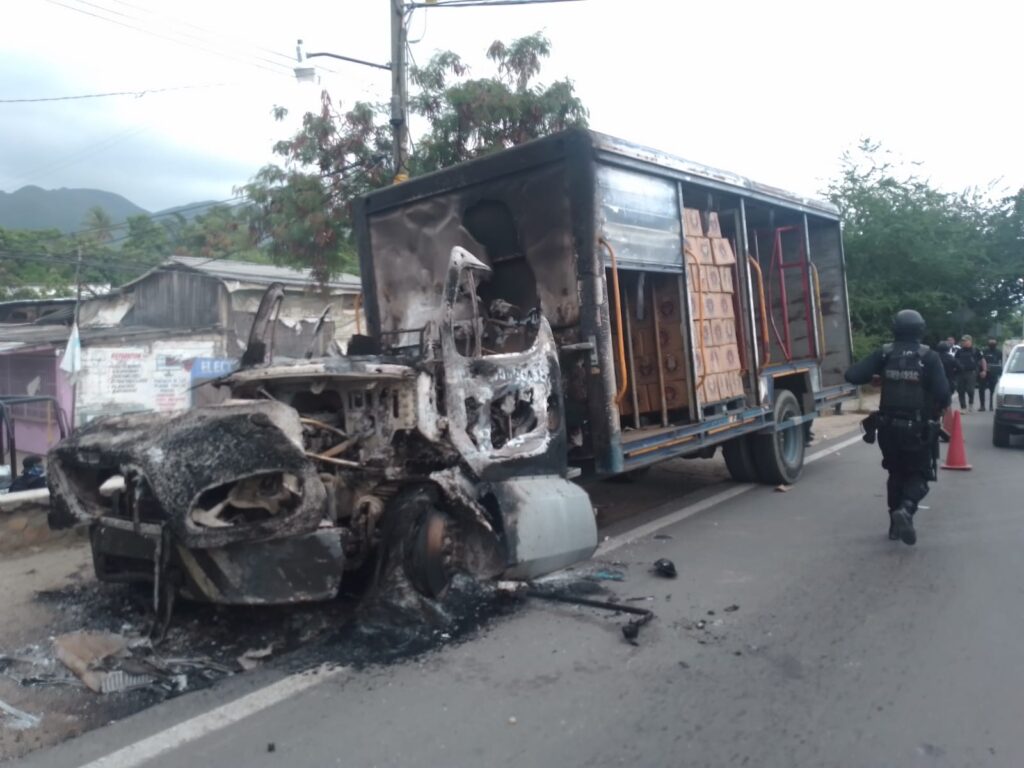 Acapulco gro, 2 de agosto de 2023-. Atendiendo las instrucciones de la Fiscal General del Estado, Mtra. Sandra Luz Valdovinos Salmerón, agentes de la Policía Ministerial, en coordinación con elementos de Ejército Mexicano, aseguraron vehículos que fueron incendiados sobre la carretera Acapulco-Zihuatanejo.