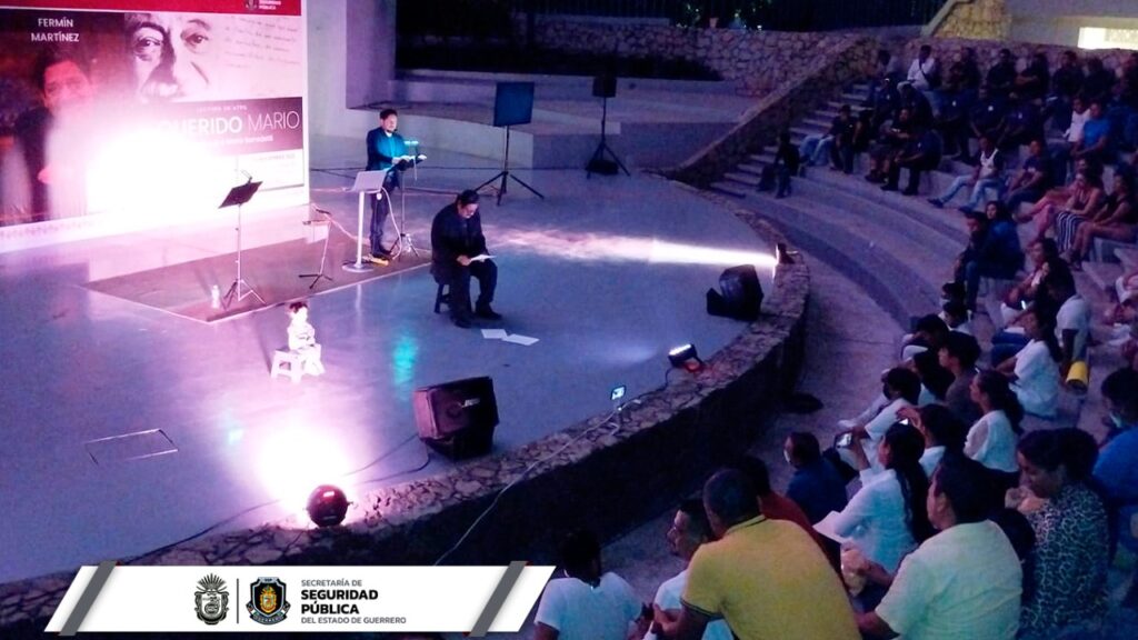 Acapulco, Guerrero, 10 de noviembre de 2022.- Como parte de las acciones para generar una cultura de paz, la Secretaría de Seguridad Pública Estatal llevó a cabo la presentación de la lectura Mi Querido Mario, homenaje al escritor y poeta Mario Benedetti, en voz del primer actor, Fermín Martínez y el productor guerrerense, Rafael Aparicio.