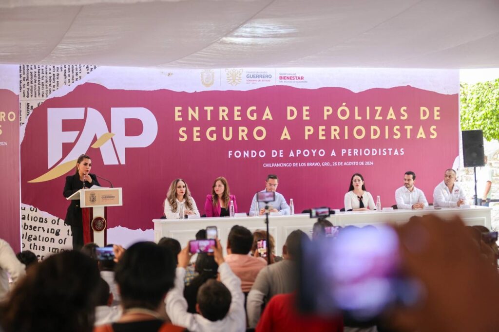 Chilpancingo, Gro., 26 de agosto de 2024. – Con el compromiso de garantizar el libre ejercicio de la prensa y que la sociedad cuente con un gremio periodístico fortalecido en Guerrero, la gobernadora Evelyn Salgado Pineda, acompañada por el secretario de Bienestar, Pablo Gordillo Oliveros, y el Director General de Comunicación Social del Estado, René Posselt Aguirre, entregó 404 Pólizas de Seguro de Vida a Periodistas afiliados al Fondo de Apoyo a Periodistas (FAP) 2024.