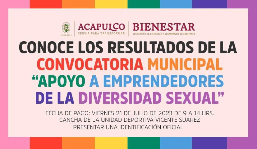 Acapulco, Gro., 20 de julio de 2023. El Gobierno Municipal que encabeza la presidenta municipal, Abelina López Rodríguez, a través de la Secretaría de Bienestar y Desarrollo Comunitario, da a conocer los resultados de la Convocatoria Municipal “Apoyo a Emprendedores de la Diversidad Sexual”, donde fueron seleccionados 500 emprendedores de la comunidad LGBTTTQI+.