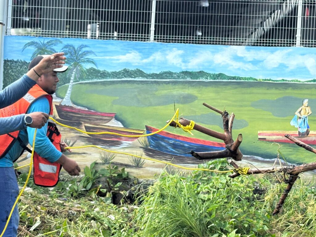 “Por instrucciones de nuestra presidenta, Abelina López Rodríguez, de mantener todos los mercados limpios y en óptimas condiciones, hoy nos encontramos en el mercado de Tres Palos, donde solicitaron el desazolve; el trabajo que está realizando es la poda de toda la maleza alrededor del canal, del cauce del canal para que se pueda liberar”, señaló.