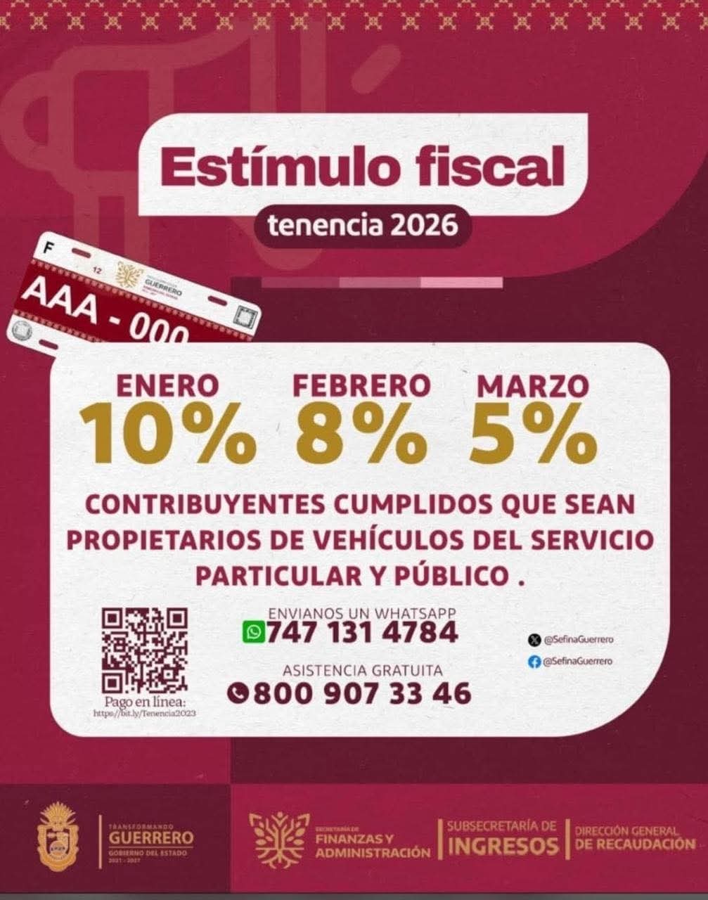 Chilpancingo, Gro., 9 de enero de 2026.– El Gobierno del Estado, que encabeza la gobernadora Evelyn Salgado Pineda, anunció el Estímulo Fiscal Tenencia 2026, dirigido a propietarios de vehículos particulares y de transporte público, con el objetivo de incentivar el cumplimiento oportuno de esta contribución.