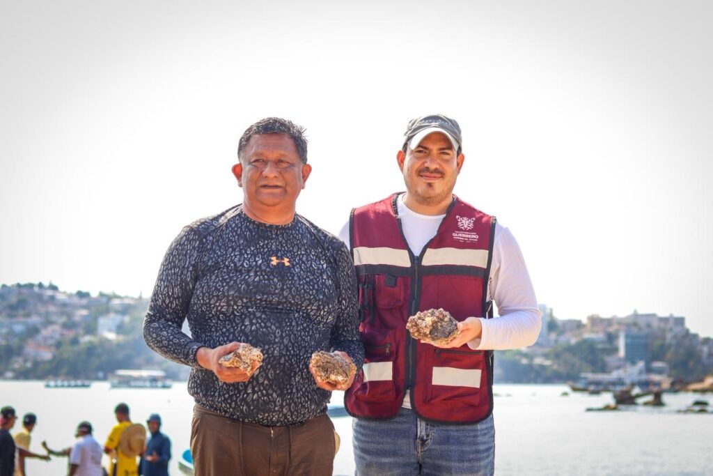 Acapulco, Gro., a 08 de diciembre de 2025.- El director general de Pesca y Acuacultura, Heber de Jesús Sánchez Paredes, y el presidente de la Unión de Federaciones y Sociedades Cooperativas de Buzos y Pescadores en el Estado de Guerrero, Orlando Peña Damián, llevaron a cabo acciones de repoblamiento de ostión de roca en la bahía de Acapulco, a fin de busca proteger y conservar la especie, cuya presencia se ha visto afectada tras los daños provocados por los huracanes Otis y John.