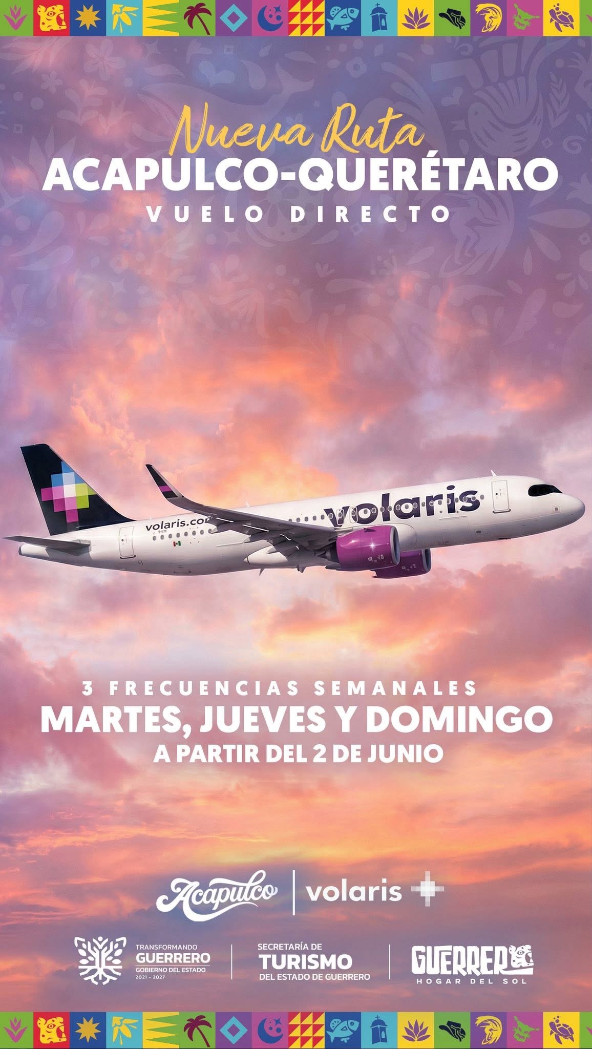 La aerolínea Volaris anunció la apertura de dos nuevas rutas hacia Guerrero, que iniciarán operaciones a partir del 2 de junio de 2026. La primera conectará Acapulco – Querétaro, con tres frecuencias semanales los días martes, jueves y domingo, fortaleciendo la conectividad del puerto con la región del Bajío. La segunda ruta será Zihuatanejo – Puebla, también con tres frecuencias semanales, los días martes, jueves y sábado, ampliando la oferta aérea hacia la Costa Grande.