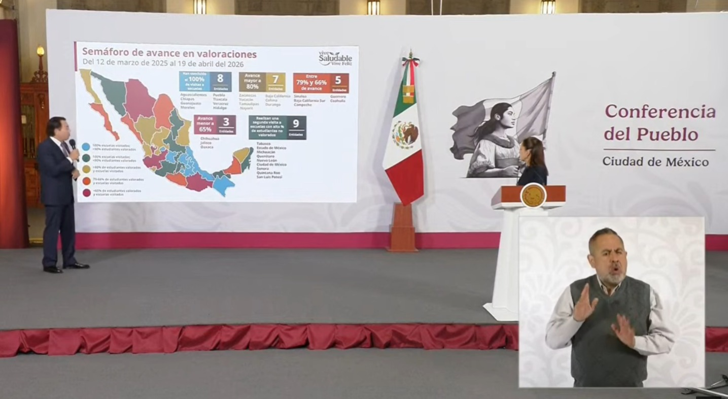 Chilpancingo, Gro., 20 de abril de 2026.– Durante la conferencia matutina de este lunes, encabezada por la presidenta Claudia Sheinbaum Pardo, el secretario de Educación Pública, Mario Delgado Carrillo, presentó el informe de avances del programa “Vive Saludable, Vive Feliz”, destacando el progreso en la cobertura nacional de valoraciones a estudiantes realizadas del 12 de marzo de 2025 al 19 de abril de 2026.