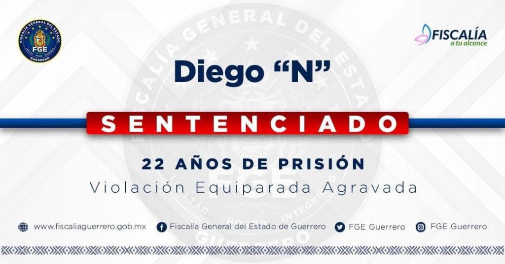 La Fiscalía General del Estado logró Sentencia Condenatoria en contra de Diego “N”, por el delito de Violación Equiparada Agravada, cometido en perjuicio de una víctima menor de edad, cuya identidad se reserva, por los hechos ocurridos el 20 de marzo del 2022, en la localidad de Mezcala, municipio de Eduardo Neri.