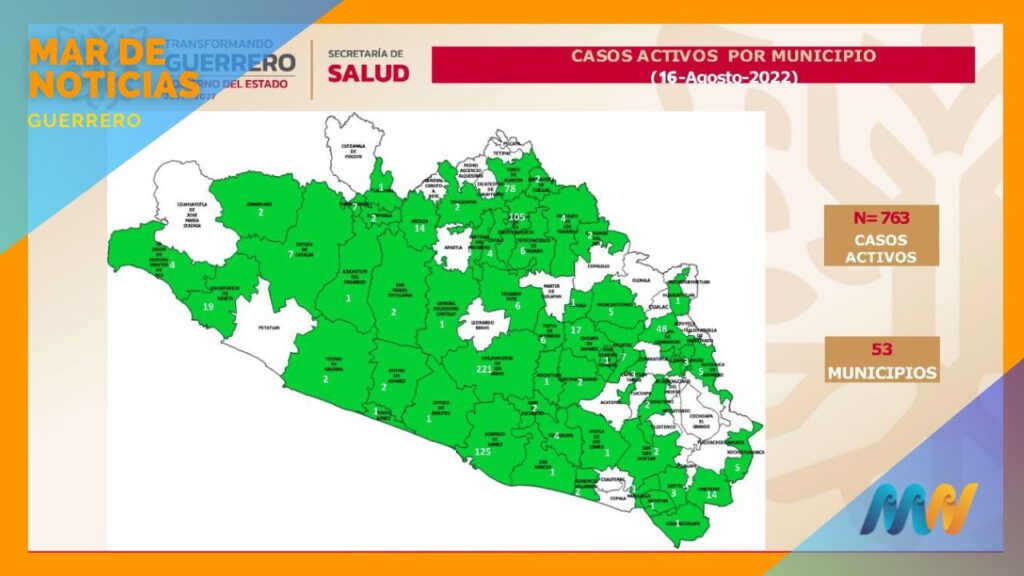 A nivel nacional se mantiene en el sitio 25 en incidencia de casos activos, que se concentran en 53 municipios, principalmente: Chilpancingo, 221; Acapulco, 125; Iguala, 105; Taxco, 78; Tlapa, 48; Zihuatanejo, 19; Chilapa, 17; Arcelia, 14; Ometepec, 14; y Atlixtac, 7.